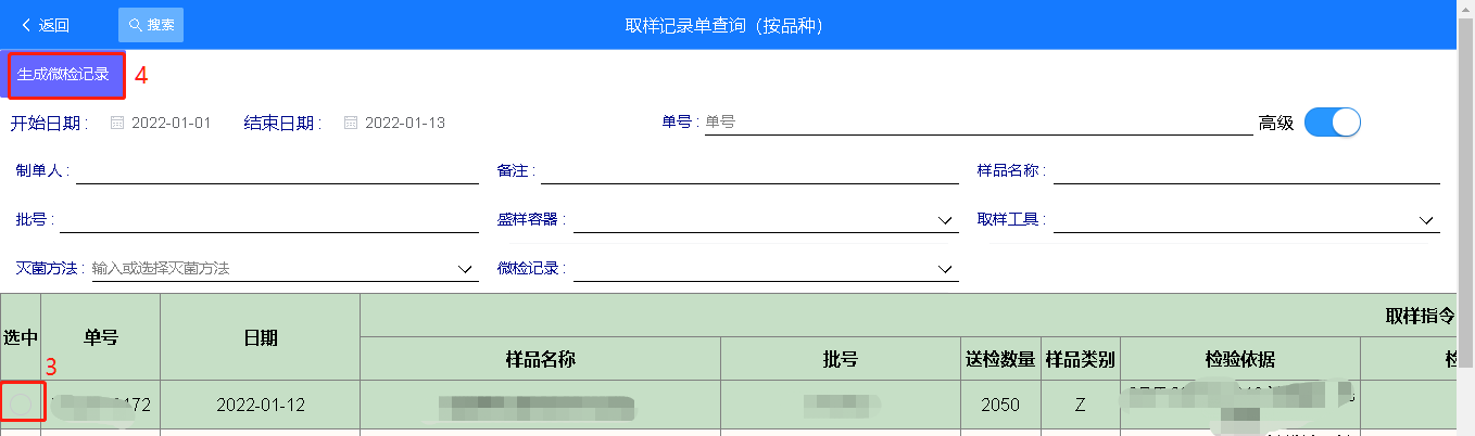 1-4、操作步骤1.点击微检105;2.点击取样记录单查询(按品种);3.选择单号;4.点击生成微检记录,填写微生物检验报告; 微生物检验表格对取样记录填写检验报告; |