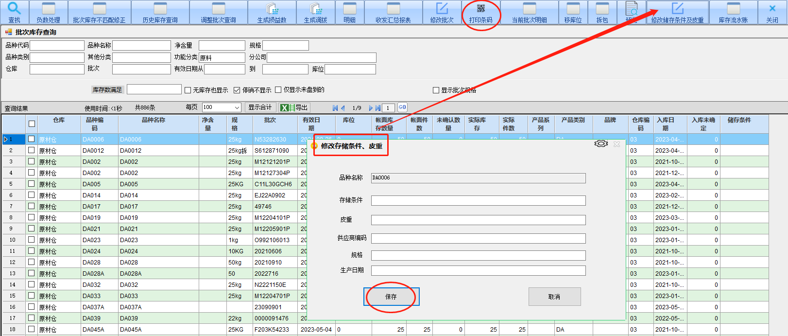 再库存管理-库存批次查询-查询对应的原料打印标签,库存打标信息不完善可以修改信息后再打印