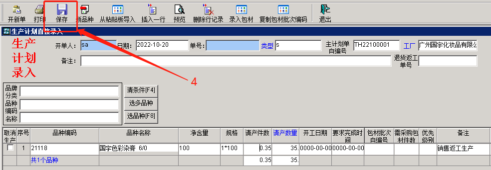 4.点击 保存(可修改生产数量),按生产下达流程 打印标签和扫码入库